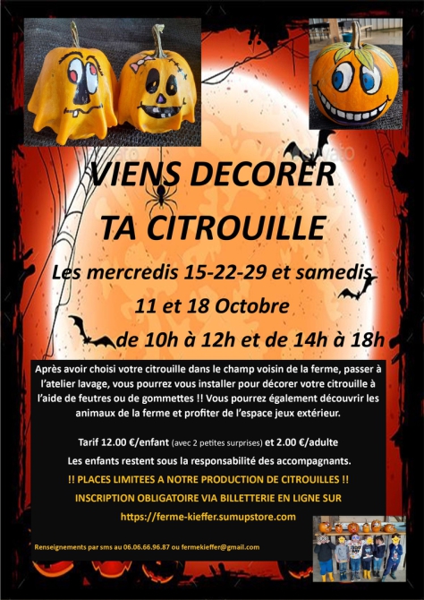 Cette année nous vous proposons de vous inscrire pour les ateliers décorations de citrouille des 11/15/18/22 et 29 Octobre directement en achetant vos billets en ligne.